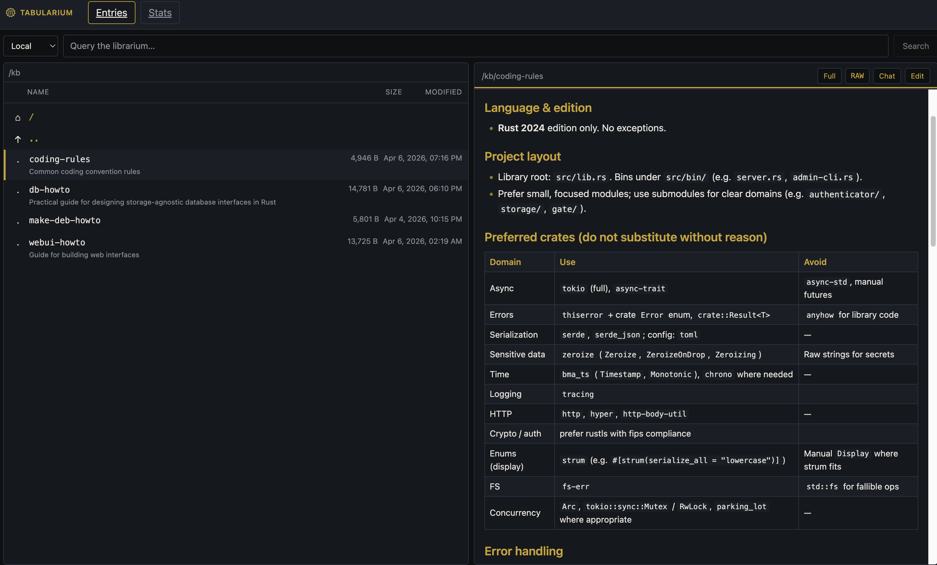 Tabularium captures chats, docs, meetings, and tasks as durable markdown in a real directory tree - then makes it searchable and accessible to AI tools via MCP, and to humans via web UI, CLI, REST, and JSON-RPC.